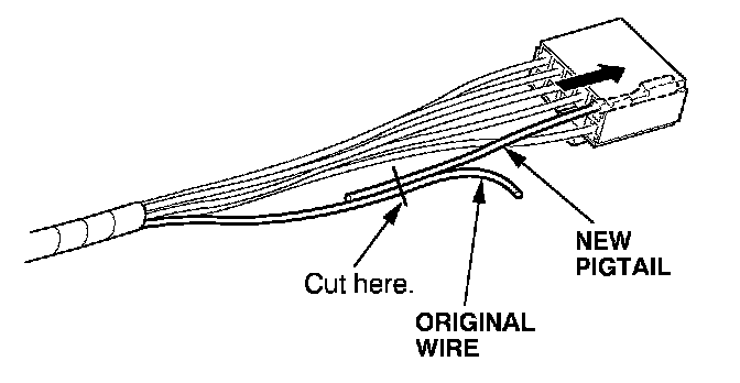 6. Lay the pigtail and the original wire side-by-side, and cut off both ends at once. If you are making more than one splice, do not cut each pigtail at the same location; the resulting "lump" of splice connectors would interfere with rewrapping the harness. Instead, cut the first pigtail close enough to the terminal so you will have room to make each remaining cut about 20 mm (3/4 inch) farther down on the next pigtail.