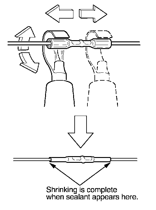 13. Plug in the heat gun, and turn it on. Start at the middle of the splice connector, and move the gun toward the ends as the tube shrinks. Apply heat evenly by rotating the curved heat spreader around the splice connector. Shrinking is complete when a small amount of sealant appears at each end of the tube.