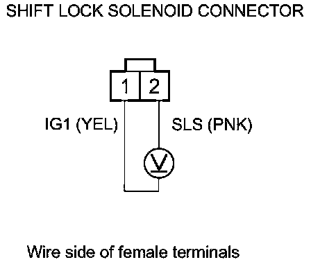11. Release the brake pedal, and measure the voltage between shift lock solenoid connector terminals No. 1 and No. 2. The shift lever must be in P.