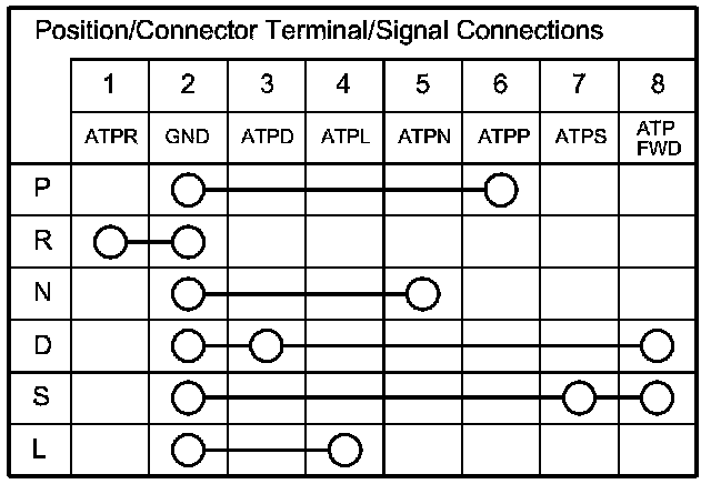 3. Check for continuity between terminals at the transmission range switch connector. There should be continuity between the terminals in the following table for each switch position.