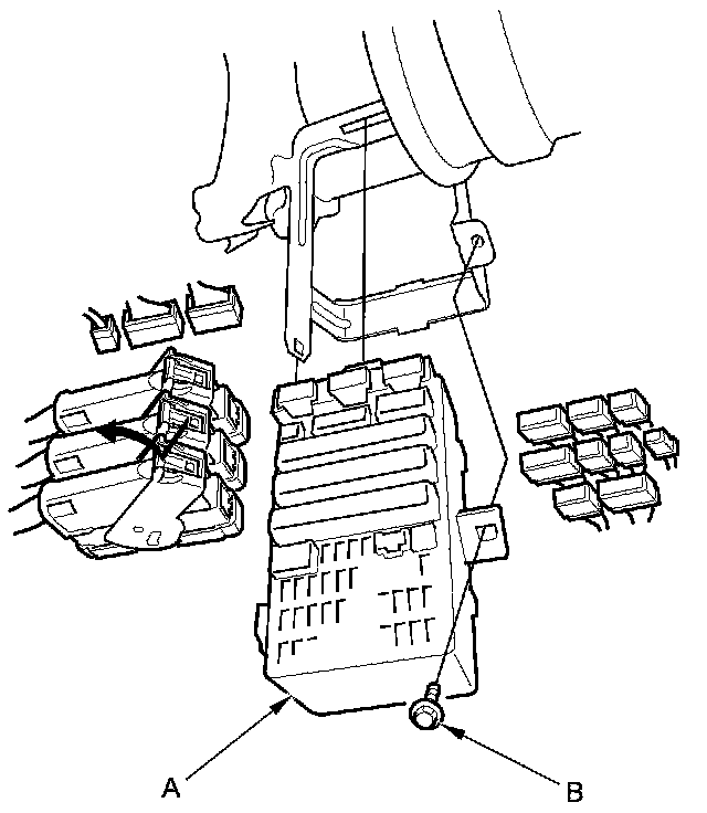 4. Remove the mounting bolt (B), and pull the fuse/relay box away from the body.
