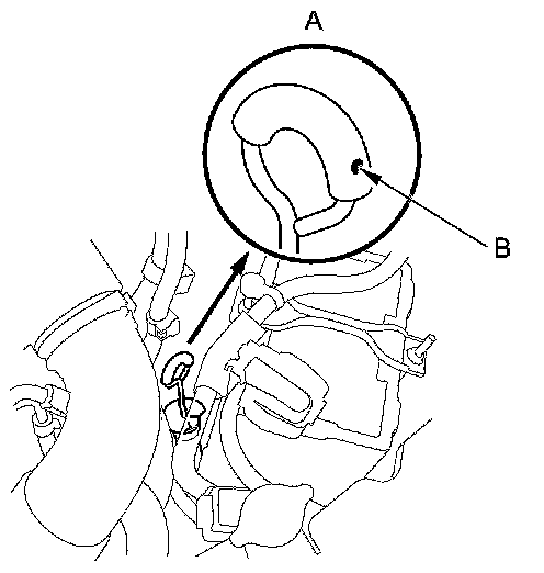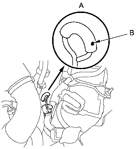 9. Insert the dipstick (A) back into the tube with the dot (B) on the handle facing to the left side of the vehicle.