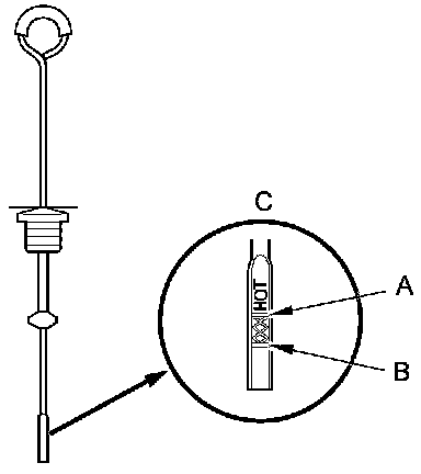 5. Remove the dipstick, and check the CVTF level. It should be between the upper mark (A) and the lower mark (B) on the HOT level (C).