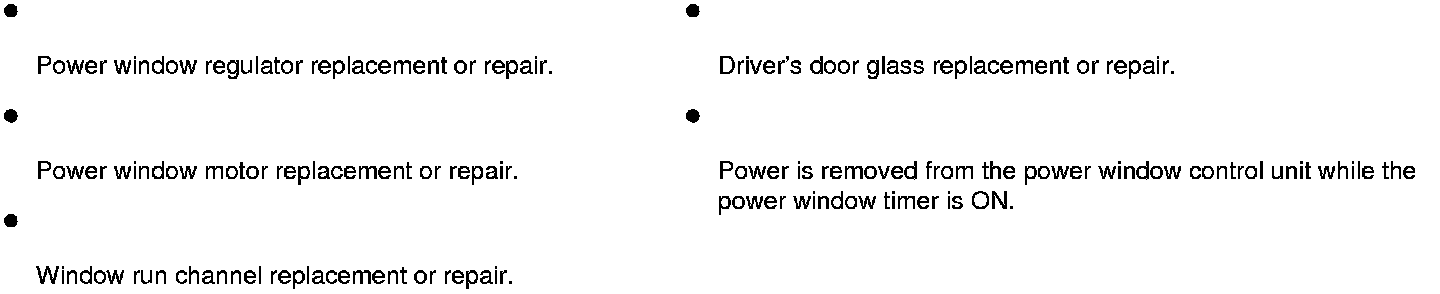 13. Confirm that the power window control unit is reset by using the driver's window AUTO UP and AUTO DOWN functions. If the window still does not work in AUTO, repeat the procedure several times, paying close attention to the 5 second time limit between steps. If it still does not work, refer to the master switch input test Power Window Master Switch Input Test.