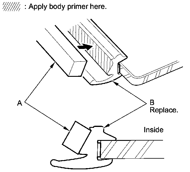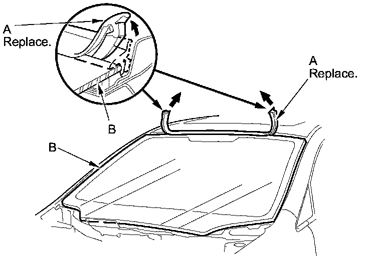 2. Remove the windshield molding (A) from the upper edge of the windshield (B). If necessary, cut the windshield molding with a utility knife.