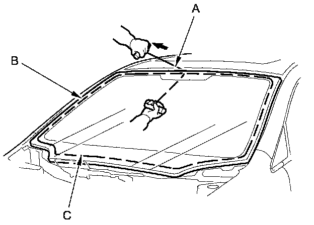 6. With a helper on the outside, pull the piano wire (A) back and forth in a sawing motion. Hold the piano wire as close to the windshield (B) as possible to prevent damage to the body and the dashboard. Carefully cut through the rubber dam and the adhesive (C) around the entire windshield.