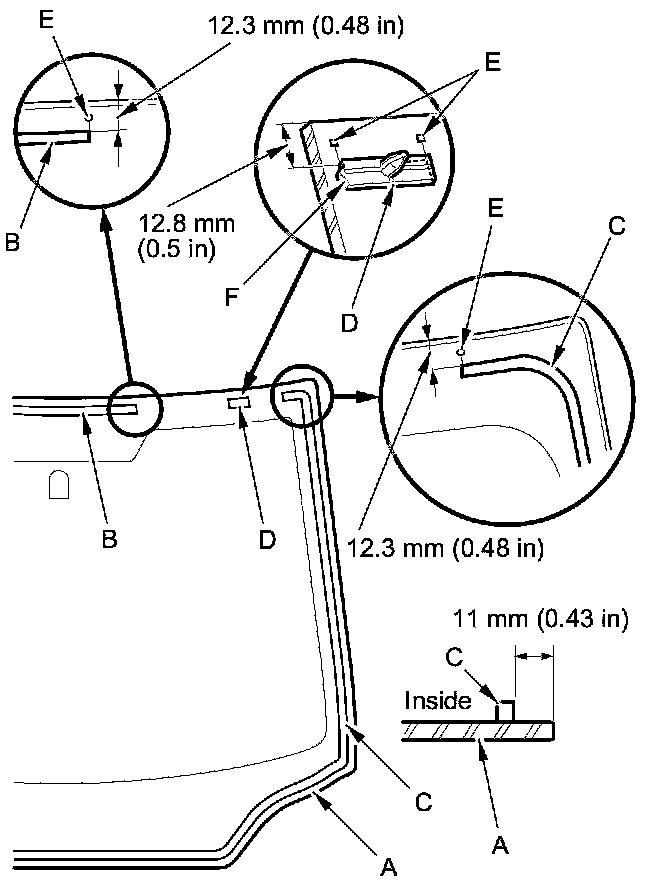 11. Apply glass primer to the upper clips mounting areas on the windshield (A), and let it dry. Remove the adhesive backing and attach the upper rubber dams (B), the side rubber dam (C), and the upper clips (D) with adhesive tape to the inside face of the windshield as shown: