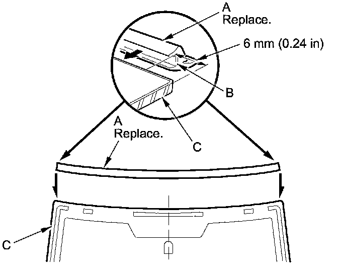 12. Attach the windshield molding (A) with adhesive tape (B) to the upper edge of the windshield (C). Be careful not to touch the windshield where the adhesive will be applied.