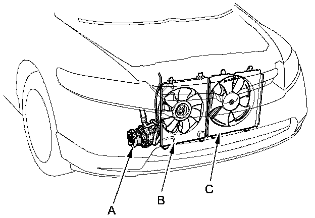 12. Check that the A/C condenser fan (B) and the radiator fan (C) operate when the A/C compressor clutch is engaged and blow air toward the engine compartment. If one or both of the fans is not working properly, refer to the symptom troubleshooting.