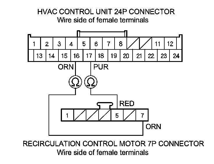 11. Check for continuity between following terminals of the HVAC control unit 24P connector and the recirculation control motor 7P connector.