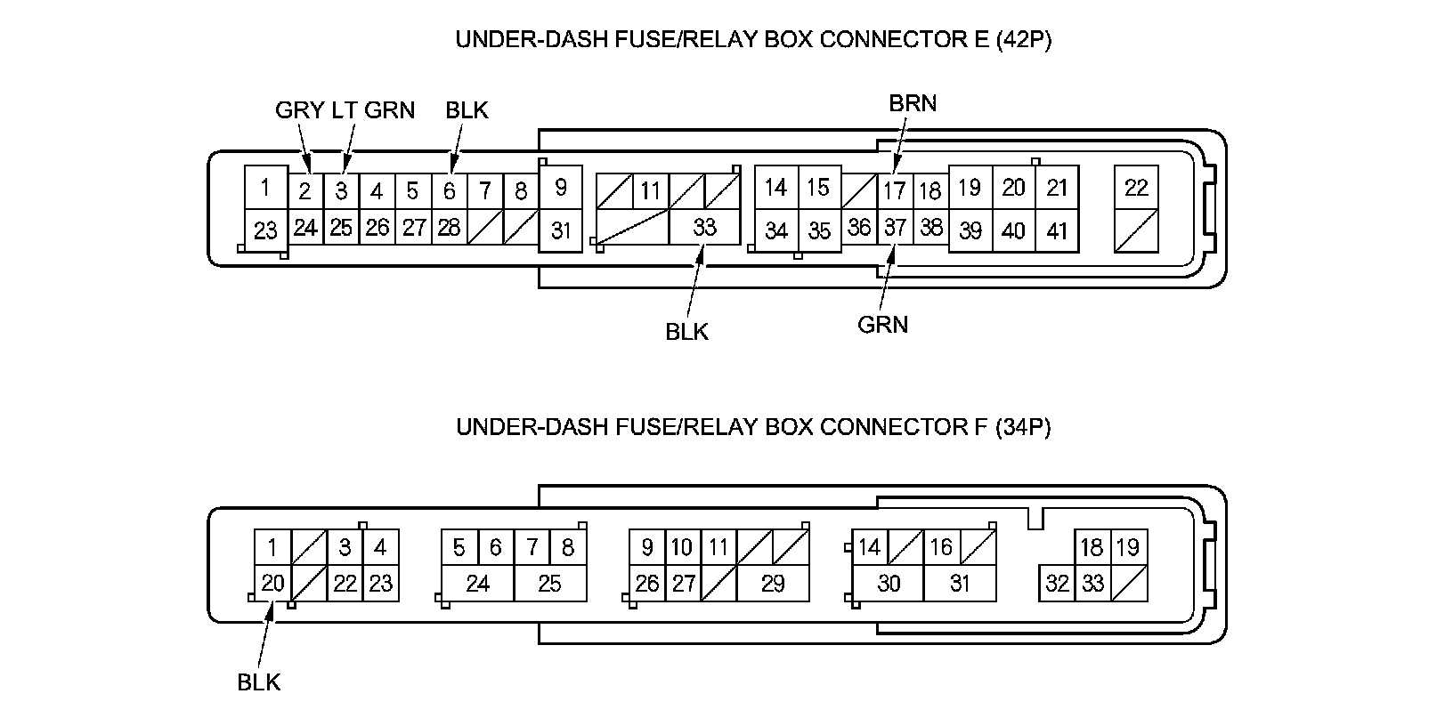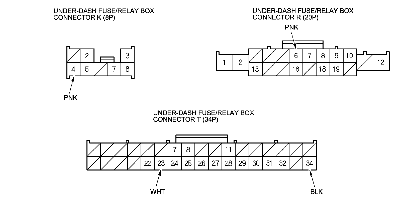 3. Disconnect under-dash fuse/relay box connectors E, F, K, R, and T.