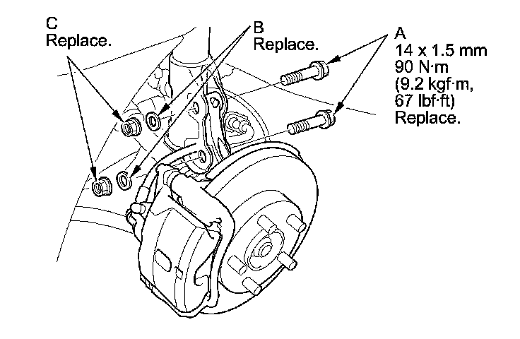 - Install the washers (B) included adjusting bolt set between the front damper and self-locking nut (C).