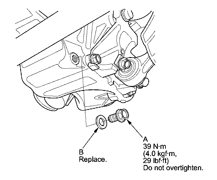 3. Reinstall the drain bolt with a new washer (B) and torque to specification.