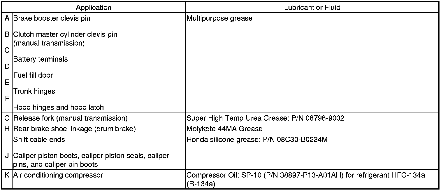 - Lubricate the following areas using the recommended lubricants and fluids.