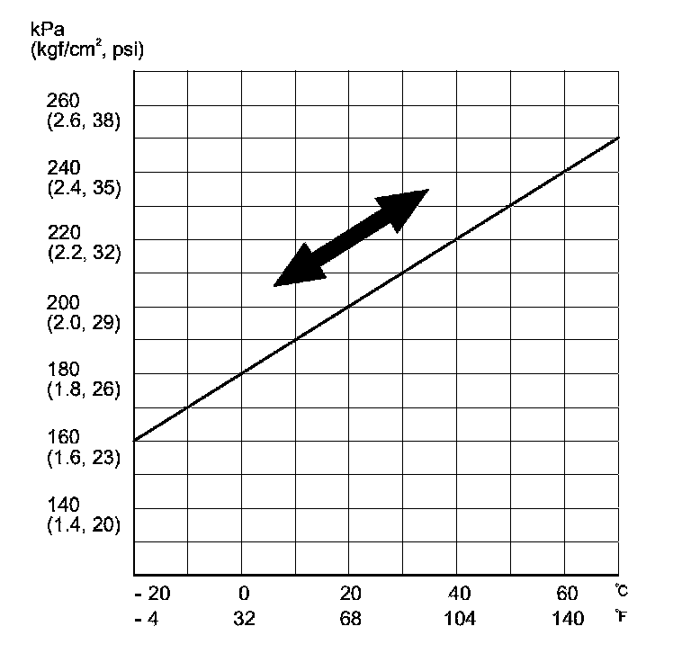 Tire pressures increase slightly as the temperature in the tires rises during driving. Pressures can also increase or decrease slightly with changes in outside air temperature. A temperature change of about 18 °F (10 °C) changes tire pressure by about 10 kPa (0.1 kgf/cm2, 1.5 psi). If the temperature drops, tire pressure could decrease enough to turn on the low tire pressure indicator, but later, the tire temperature could increase enough to turn the indicator off. To resolve a complaint of such intermittent indications, confirm and clear the stored DTC(s) and check the tire pressures. Then explain to the customer how temperature changes can affect the system.