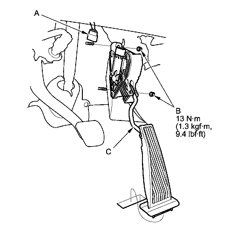 2. Remove the accelerator pedal module (C).