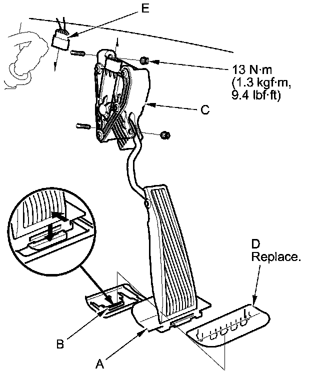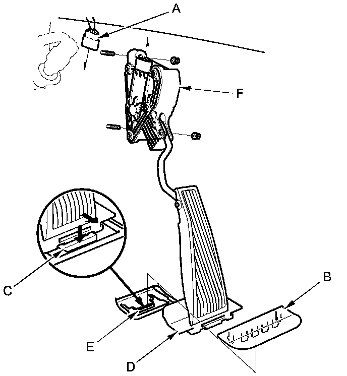 3. Push the tab (C), and remove the accelerator pedal pad (D) from the pedal stop (E).