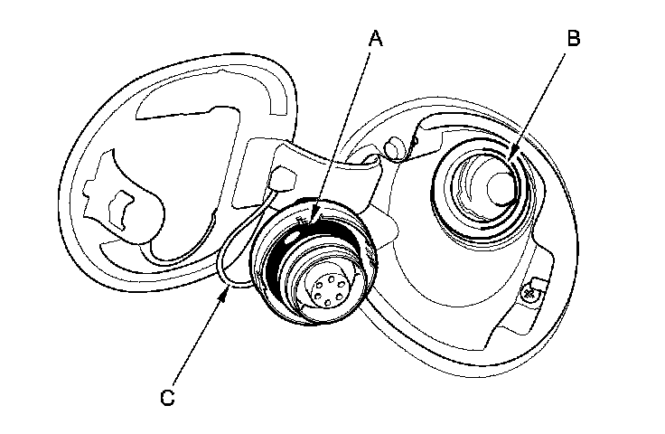 2. Check the fuel fill cap seal (A) and the fuel fill pipe mating surface (B). Verify that the fuel fill cap tether cord (C) is not caught under the cap.