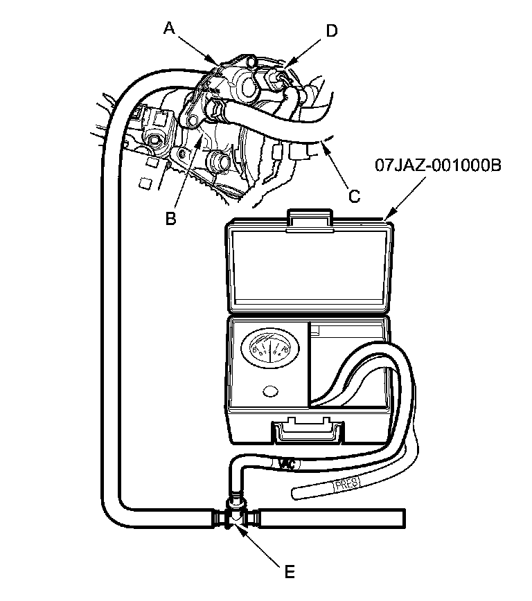 8. Remove the EVAP canister purge valve (A) from the throttle body (B) without disconnecting the vacuum hose (C) or the EVAP canister purge valve 2P connector (D) Service and Repair, then connect a T-fitting (E), a vacuum gauge, and a vacuum pump/gauge, 0-30 inHg, to the EVAP canister purge valve as shown.