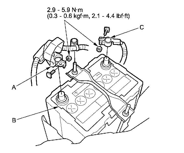 3. Reconnect the positive cable (A) to the battery (B) first, then reconnect the negative cable (C) to the battery.
