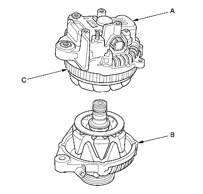 8. Separate the rear housing (A) and the drive-end housing (B) with the stator (C) attached to the rear housing.