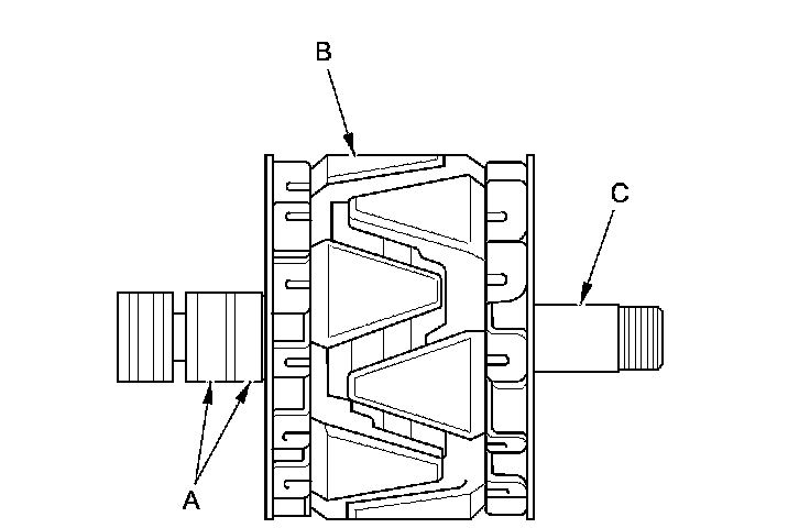 19. Check for no continuity between each slip ring and the rotor (B) and the rotor shaft (C).