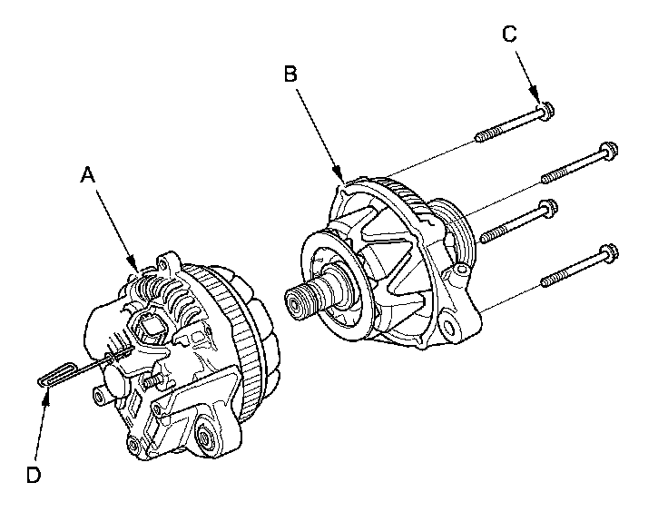 24. Put the rear housing assembly (A) and the drive-end housing/rotor assembly (B) together, tighten the four through bolts (C), and pull out the pin (D).