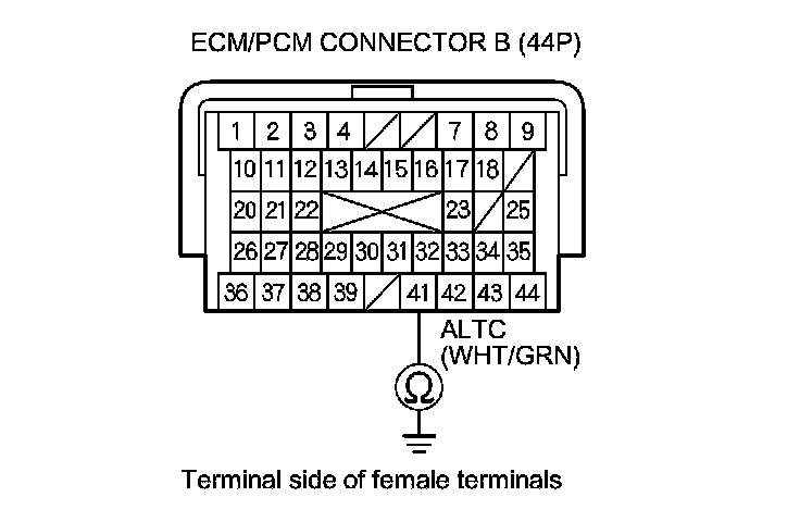 13. Check for loose terminals and connectors, then check for continuity between ECM/PCM connector terminal B41 and alternator 4P connector terminal No. 2.