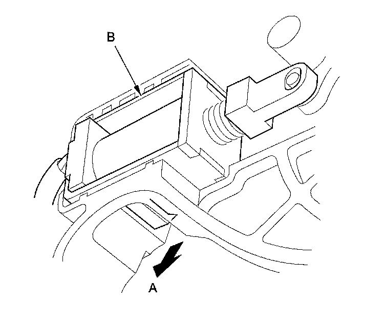 2. Release the shift lock solenoid lock (A), then remove the shift lock solenoid (B).