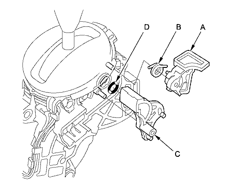 4. Remove the shift lock stop (C) and the stop cushion (D), and replace the shift lock stop or the stop cushion.