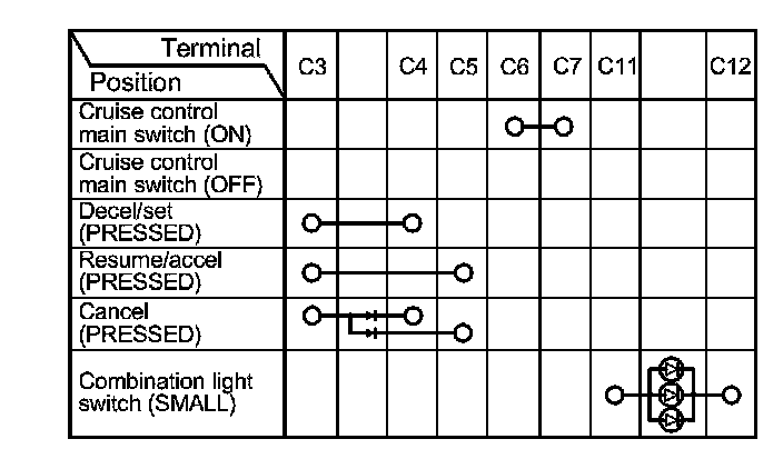 4. Check for continuity between the terminals in each cruise control combination switch position according to the table.