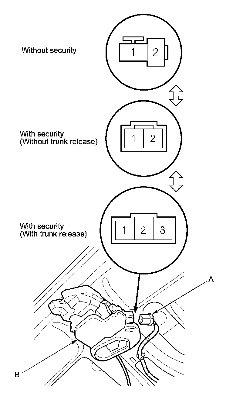 2. Disconnect the connector (A) from the trunk lid latch (B).