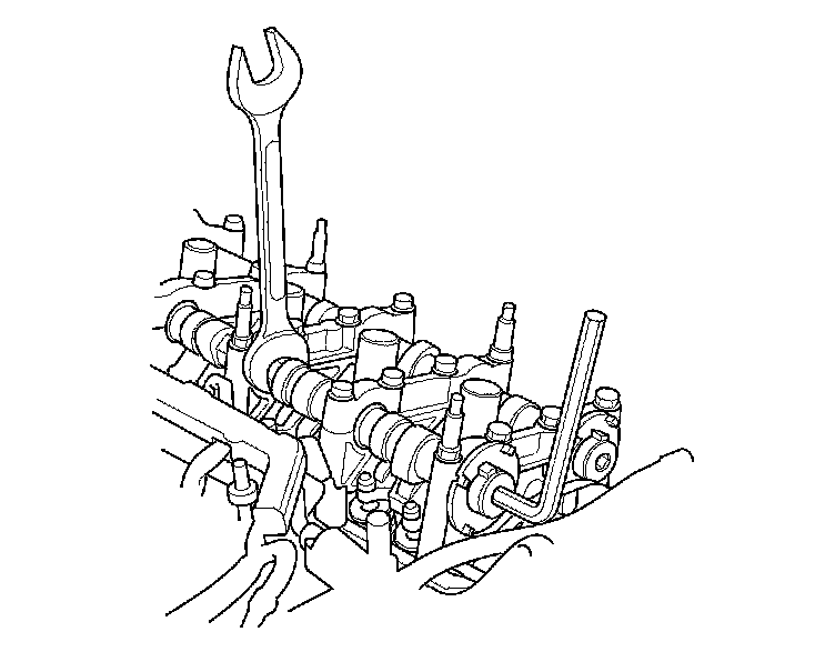 2. Hold the intake camshaft with a 27 mm open-end wrench, then loosen the bolt.