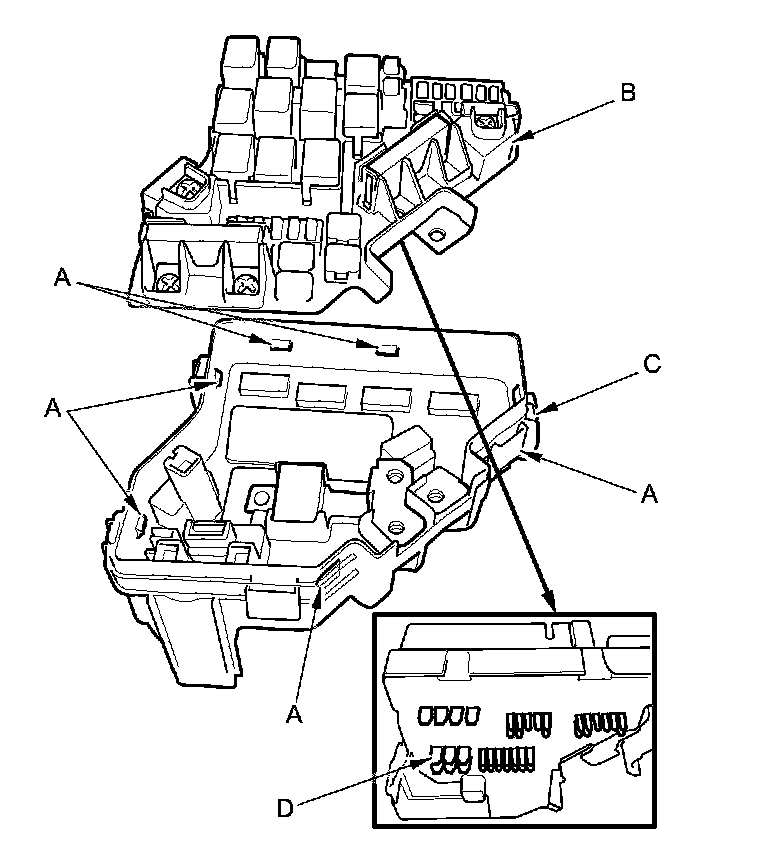5. Turn the housing over again. Using two flat-tip screwdrivers, release the tabs (A), and pry up the fuse/relay box base (B) from the fuse/relay box housing (C).