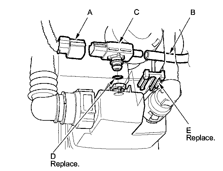 5. Install the parts in the reverse order of removal with a new O-ring (D) and a new retainer (E).