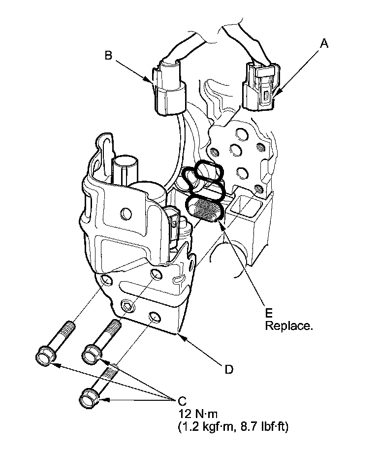 5. Install the parts in the reverse order of removal with a new rocker arm oil control valve filter (E).