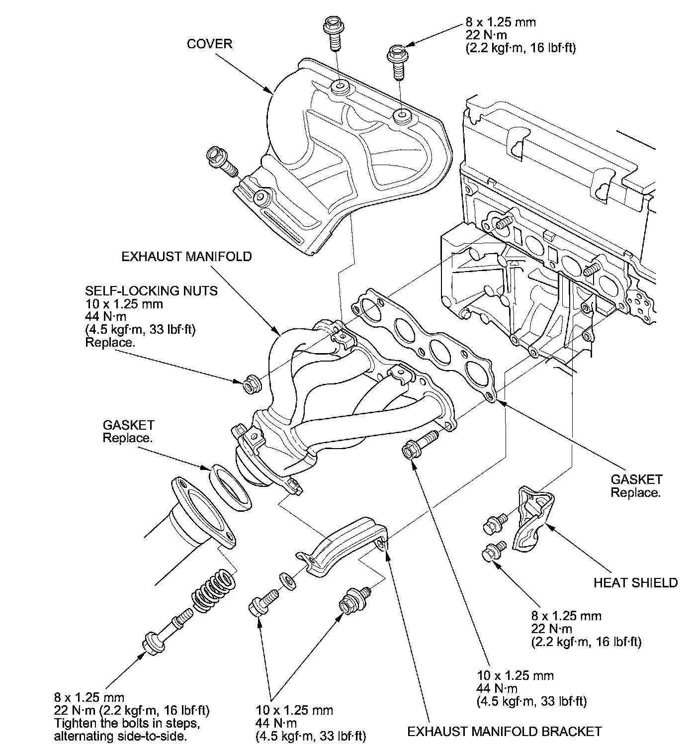 Tighten the bolts and nuts in a crisscross pattern in three steps, beginning with the inner bolt