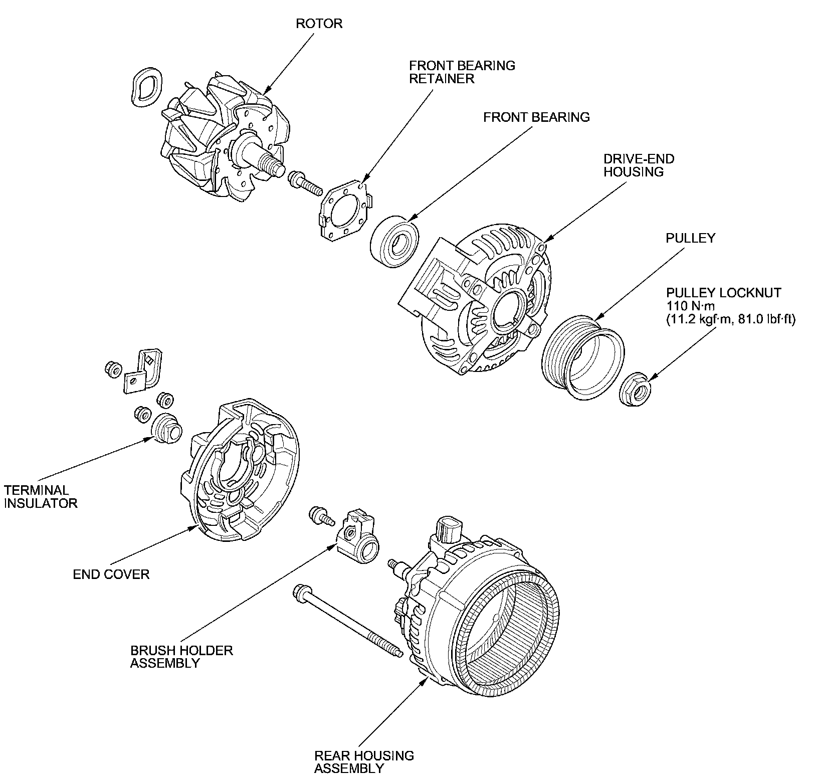 16. If you removed the pulley, put the rotor in the drive-end housing, then tighten its locknut to 110 Nm (11.2 kg-m, 81.0 lb-ft).