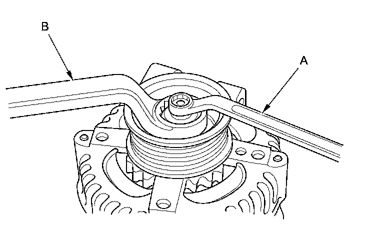 3. If the front bearing needs replacing, remove the pulley locknut with a 10 mm wrench (A) and a 22 mm wrench (B). If necessary, use an impact wrench.