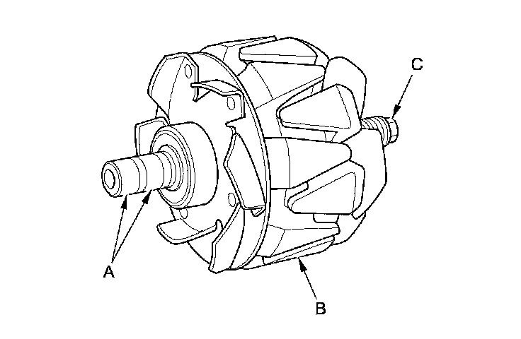 15. Check for continuity between each slip ring and the rotor (B) and the rotor shaft (C).