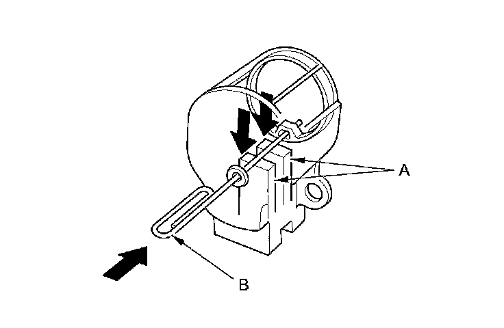 19. Push the brushes (A) in, then insert a pin or drill bit (B) (about 1.6 mm (1/16 in) diameter) to hold them there.