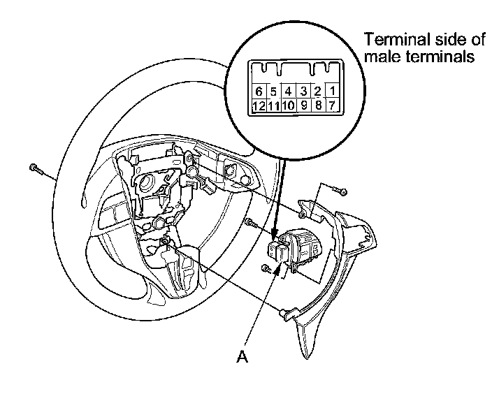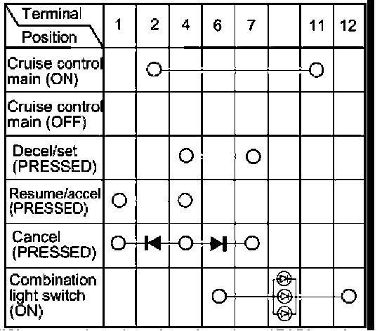 3. Check for continuity between the terminals in each cruise control combination switch position according to the table: