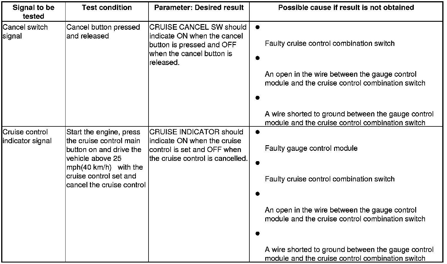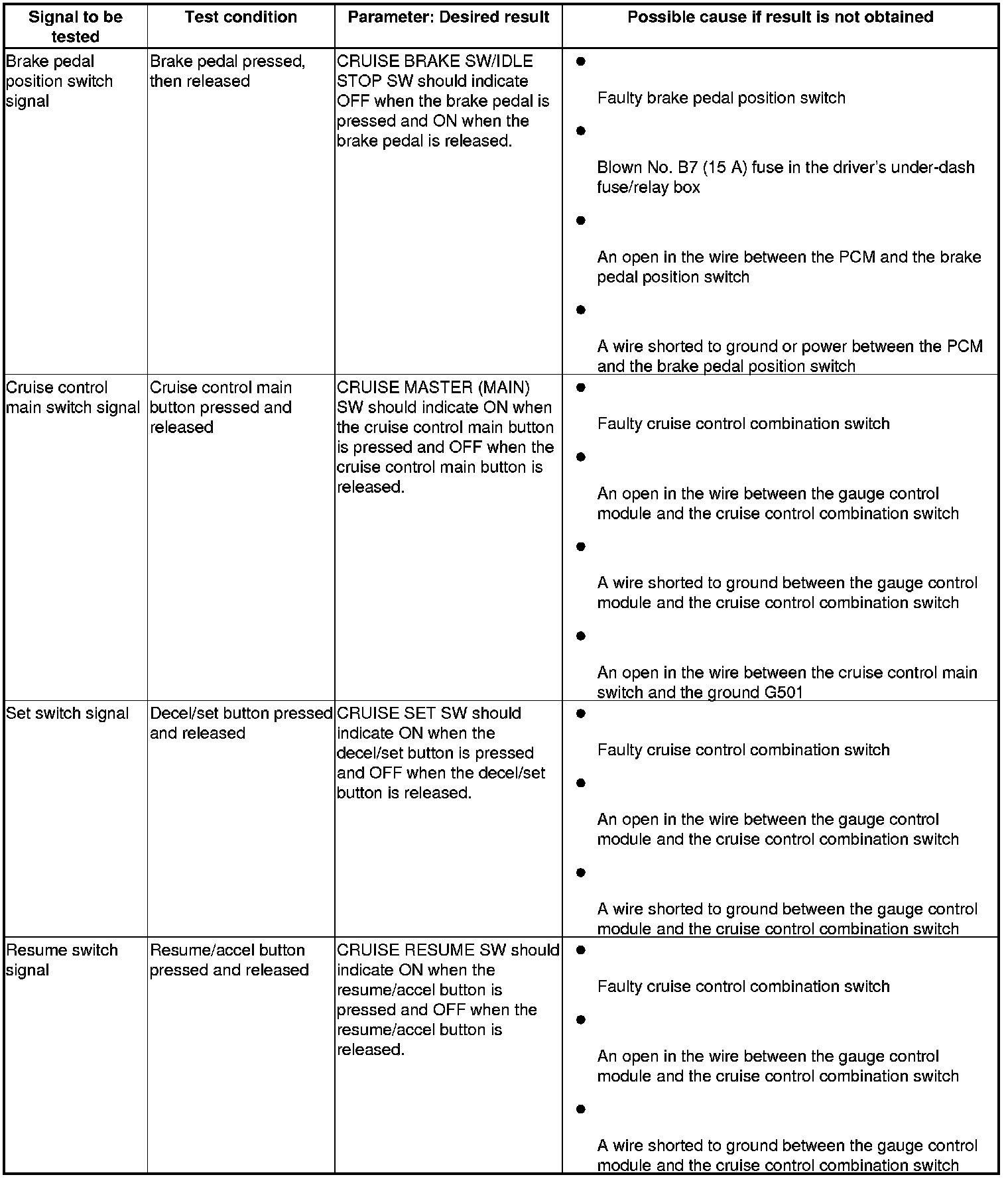 NOTE: Intermittent failures are often caused by loose circuit connections. While monitoring cruise control inputs, flex the circuit wires, and note if any of the test results change.