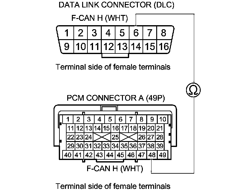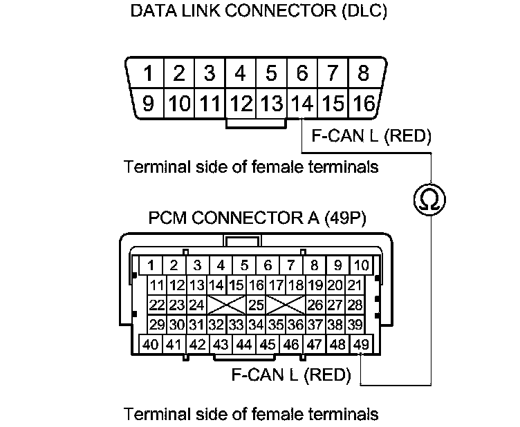 32. Check for continuity between PCM connector terminal A49 and DLC terminal No. 14.