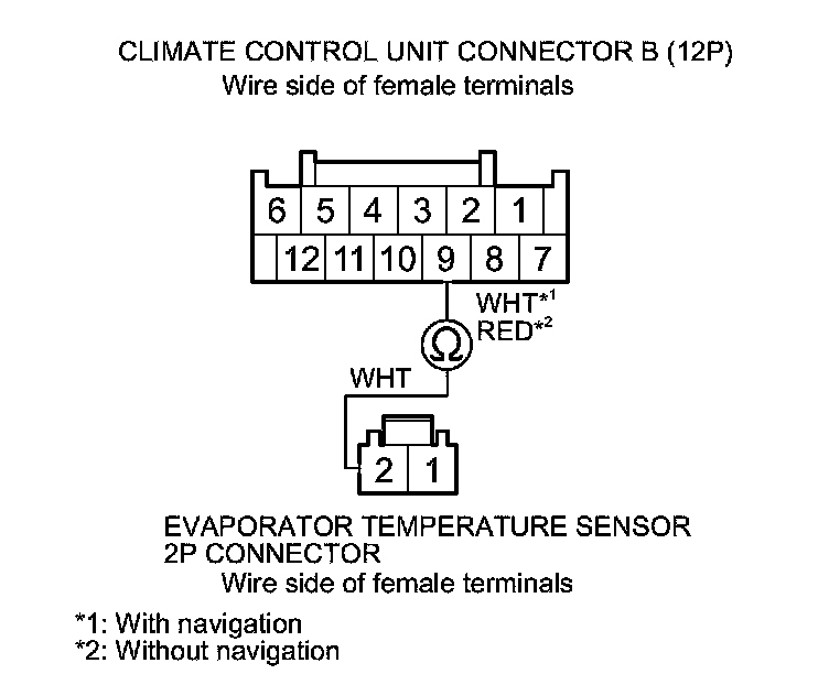 14. Check for continuity between climate control unit connector B (12P) terminal No. 9 and evaporator temperature sensor 2P connector terminal No. 2.