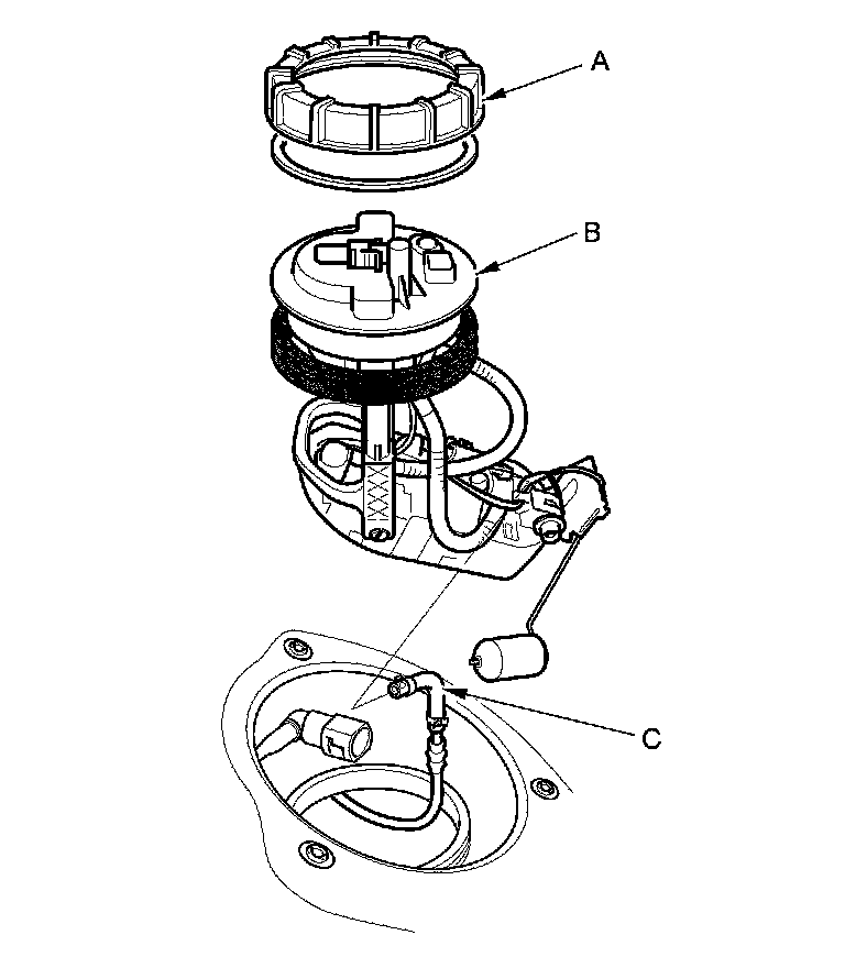 5. Disconnect the quick-connect fitting (C) from the fuel tank unit.