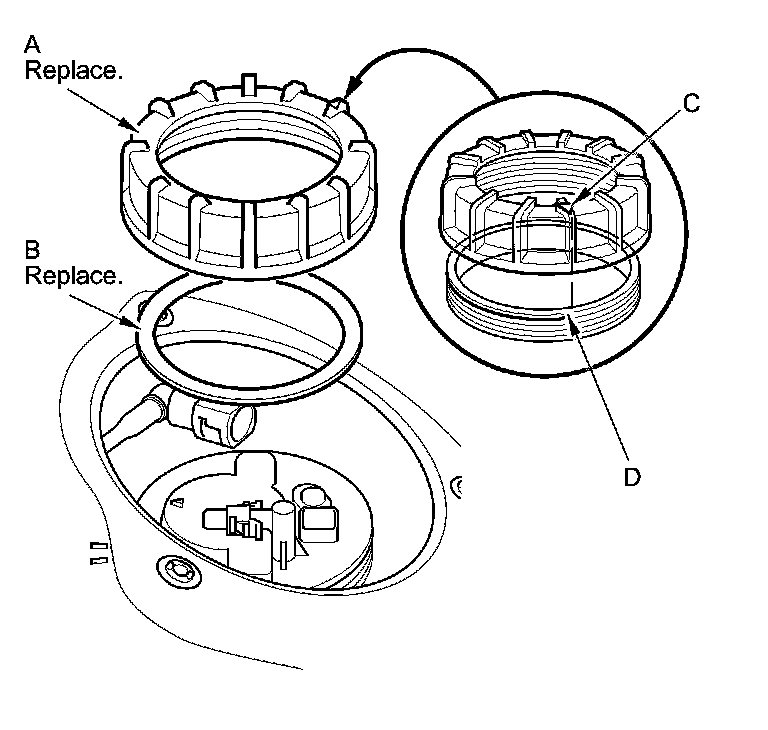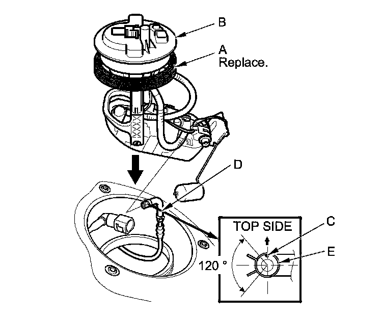 1. Temporarily attach a new base gasket (A) to the fuel tank unit (B), position the mark of the transfer tube (C) up, connect the transfer tube (D), then insert the fuel tank unit partially into the fuel tank.
