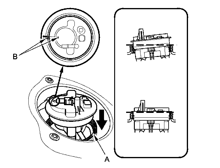 3. Align the marks (B) on the fuel tank and the fuel tank unit, then insert the fuel tank unit into the fuel tank until the fuel tank unit rests on top of the base gasket.