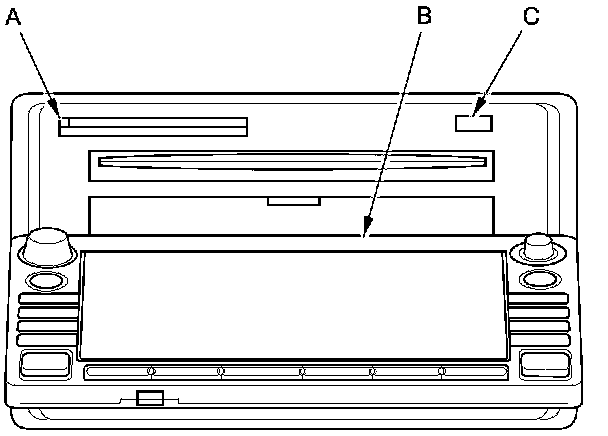 7. Push the CD eject button (C), and navigation DVD eject button and remove the discs (holding both discs by their edges to avoid fingerprints). To avoid scratches, place the navigation DVD and the customer's CD in a jewel case if available.