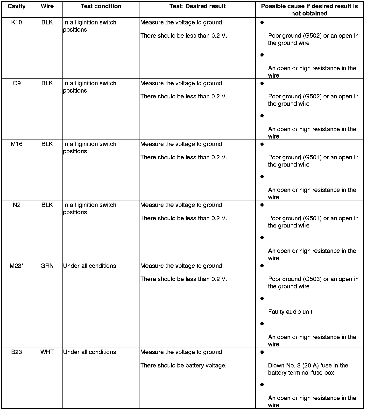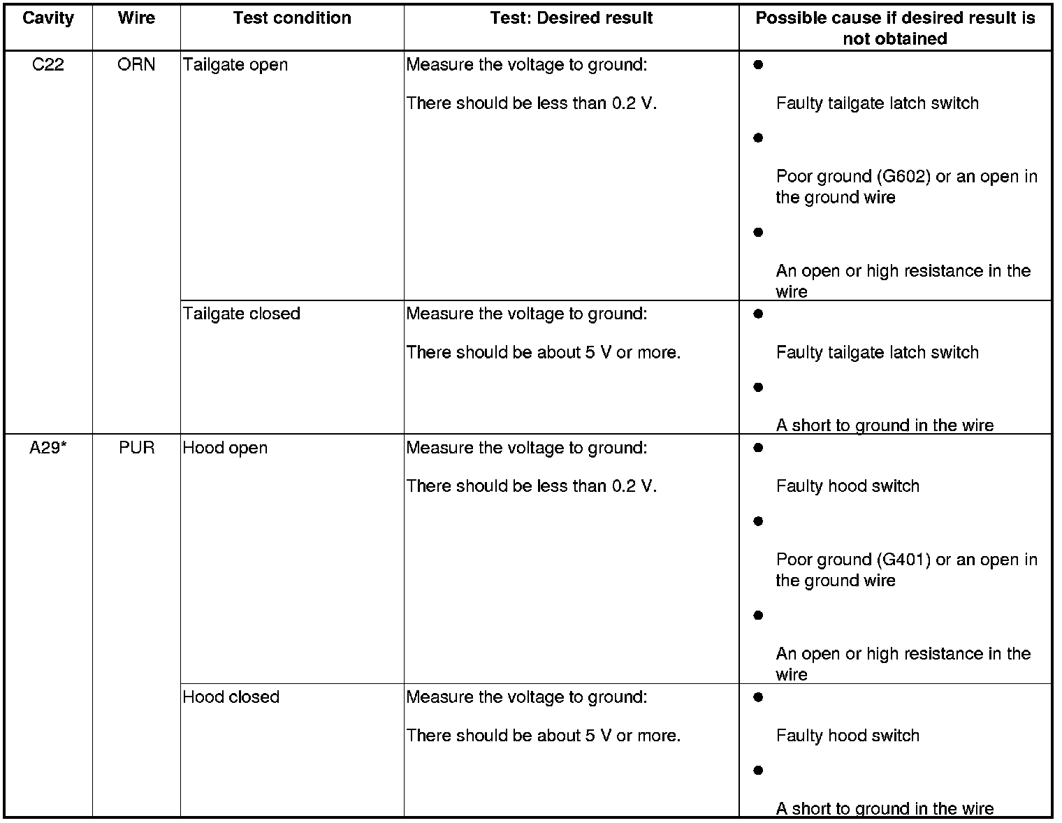 6. Reconnect the connectors to the under-dash fuse/relay box, and do these input tests at the following connectors.